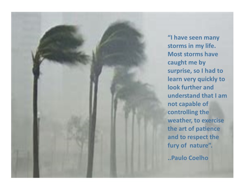 I’ve ducked for cover and wait out the storm during these times. I’ve had these blast of weather surprises come at me more than I care to mention. I have had to exercise the art of patience over the years. I’m a good friend and a listener. But that art of patience is not my strongest virtue when I’ve been dealt blast of stormy wind. I do not wish to be whipped around with the waves of emotion. I can either stay in its path or protect myself. I do not intend to be caught up in this one. I will wait out the storm. My strength has not withered, it is just knowing that this was not my storm to whether.